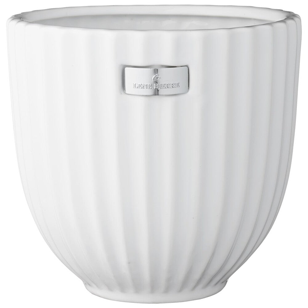 Attractive white ceramic flower pot, designed with wide grooves and a silver monogrammed badge. The flower pot measures H19xØ20 cm. Let your plants, flowers or fresh herbs get the attention they deserve in this Rosalie flowerpot, which with its simple Nordic design goes with many different styles. At Lene Bjerre, we have succeeded in creating a wide range of flower pots in all possible shades. Plants and flowers are for helping to create an authentic and cosy atmosphere in your interior design – irrespective of whether they are genuine or artificial.